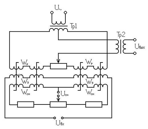 тем большая потребуется мощность управления для создания необходимой напряжённости магнитного поля в сердечники. Поэтому трансформаторную схему двухтактного магнитного усилителя реально применяют для магнитных модуляторов при Py