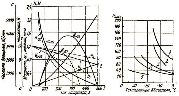 При пуске двигателя стартер должен не только преодолеть момент сопротивления двигателя прокручиванию, но и вращать его коленвал со скоростью, не ниже минимальных пусковых оборотов. На рис. 2 показана зависимость минимальных пусковых оборотов карбюраторных и дизельных двигателей от температуры двигателя при пуске.