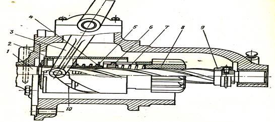 1 – вал якоря, 2 – стакан, 3 – рычаг, 4 – буферная пружина, 5 – шайба, 6 – гайка, 7 – пружина, 8 – шестерня, 9 – упорное кольцо, 10 – спиральный паз.