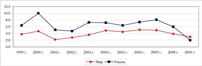 Негативное влияние международного финансового кризиса на макроэкономические показатели в России стало прослеживаться в конце III квартала 2008 г. Несмотря на это, показатели экономического роста на протяжении первых девяти месяцев 2008 г. удерживались на высоком уровне, хотя по ряду позиций и отставали от показателей аналогичного периода 2007 г. Валовый внутренний продукт в январе-сентябре 2008 г. увеличился на 7,3%, что всего на 0,3 процентных пункта ниже показателя января-сентября 2007 г. Объем промышленного производства увеличился на 5,5% по сравнению с 6,6% годом раньше; в обрабатывающей промышленности замедление темпов роста было еще более выраженным (7,7% по сравнению с 10,1% в январе-сентябре 2007 г.). Наиболее существенно снизились темпы роста в секторе услуг связи (с 21,4% в январе-сентябре 2007 г. до 13,3% в январе-сентябре 2008 г.); гораздо более умеренным было падение темпов роста в секторе платных услуг населению (с 7,2% до 6,0%) и в секторе розничной торговли (с 15,8% до 15,0%). Напротив, по ряду позиций темпы роста оказались даже более высокими, чем за аналогичный период 2007 г. Так, объем продукции сельского хозяйства увеличился на 6,5% (по сравнению с 3,4% годом раньше), а грузооборот транспорта – на 3,1% (в январе-сентябре 2007 г. наблюдалось его увеличение на 2,1%). [26]