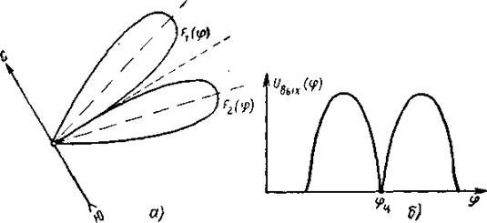 Диаграмма направленности антенны пеленгатора должна иметь в средней части провал до нуля. Этого можно добиться, например, если использовать две антенны, повёрнутые в пространстве одна относительно другой на угол, равный ширине диаграммы направленности по нулевому уровню (рис 3.7,а