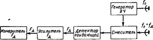 Принятые колебания смешиваются с колебаниями генератора . На выходе смесителя образуются колебания с частотой Доплера. Огибающая высокочастотных колебаний (частота биений) выделяется с помощью амплитудного детектора. Далее колебания на частоте F