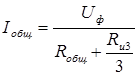 общий проходящий ток через два заземлителя (тело человека и заземлитель), Ом;
