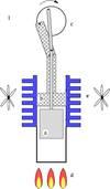 - Внешний источник тепла нагревает газ в нижней части теплообменного цилиндра. Создаваемое давление толкает рабочий поршень вверх (обратите внимание, что вытеснительный поршень неплотно прилегает к стенкам).