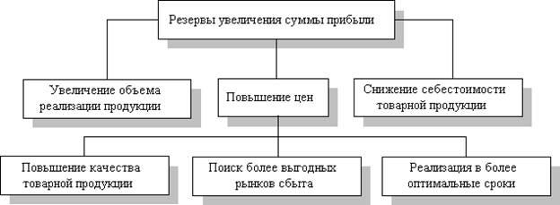 Резервы увеличения суммы прибыли определяются по каждому виду товарной продукции. Основными их источниками является увеличение объема реализации продукции, снижение ее себестоимости, повышение качества товарной продукции, реализация ее на более выгодных рынках сбыта и т.д. (рис.15)
