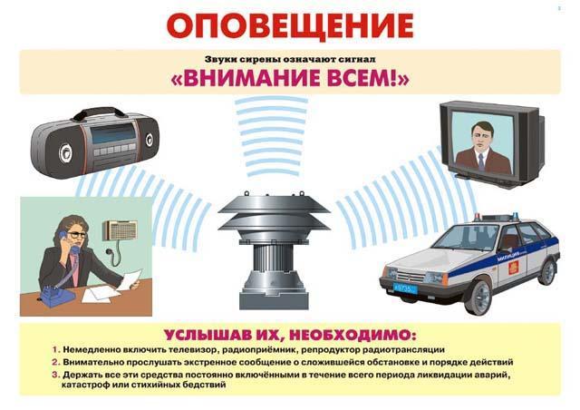 Среди защитных мероприятий гражданской обороны, осуществляемых заблаговременно, особо важное место занимает организация оповещения органов гражданской обороны, формирований и населения об угрозе нападения противника и о применении им ядерного, химического, бактериологического (биологического) оружия и других современных средств нападения. Особое значение оповещение приобретает в случае внезапного нападения противника, когда реальное время для предупреждения населения будет крайне ограниченным и исчисляться минутами. По данным зарубежной печати, считается, что своевременное оповещение населения и возможность укрытия его за 10-15 мин после оповещения позволит снизить потери людей при внезапном применении противником оружия массового поражения с 85 % до 4-7 %. Поэтому защита населения от оружия массового поражения даже при наличии достаточного количества убежищ и укрытий будет зависеть от хорошо организованной системы оповещения, организация которой возлагается на штабы гражданской обороны. Современные системы дальнего обнаружения позволяют быстро определить не только место и направление движения носителя, но и время его подлета. Это обеспечивает передачу сигнала по системе оповещения до штабов гражданской обороны и объектов. Оповещение организуется для своевременного доведения до органов гражданской обороны, формирований и населения сигналов, распоряжений и информаций гражданской обороны о эвакуации, воздушном нападении противника, радиационной опасности, химическом и бактериологическом (биологическом) заражении, угрозе затопления, начале рассредоточения и др. Эти сигналы и распоряжения доводятся до штабов гражданской обороны объектов централизованно. Сроки доведения их имеют первостепенное значение. Сокращение сроков оповещения достигается внеочередным использованием всех видов связи, телевидения и радиовещания, применением специальной аппаратуры и средств для подачи звуковых и световых сигналов. Все сигналы передаются по каналам связи и радиотрансляционным сетям, а также через местные радиовещательные станции. Одновременно передаются указания о порядке действий населения и формирований, указываются ориентировочное время начала выпадения радиоактивных осадков, время подхода зараженного воздуха и время подхода зараженного воздуха и вид отравляющих веществ. Сигналы, поданные вышестоящим штабом, дублируются всеми подчиненными штабами. С целью своевременного предупреждения населения городов и сельских населенных пунктов о возникновении непосредственной опасности применения противником ядерного, химического, бактериологического (биологического) или другого оружия и необходимости применения мер защиты установлены следующие сигналы оповещения гражданской обороны: «Воздушная тревога»; «Отбой воздушной тревоги»; «Радиационная опасность»; «Химическая тревога». В штабах гражданской обороны городов могут устанавливаться разнообразная сигнальная аппаратура и средства связи, которые позволяют с помощью пульта включать громкоговорящую связь и квартирную радиотрансляционную сеть, осуществлять одновременный вызов руководящего состава города и объектов народного хозяйства по циркулярной телефонной сети, принимать, распоряжения вышестоящих штабов и передавать свои распоряжения и с