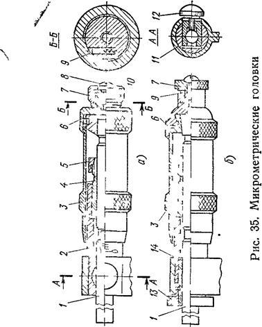 показана микрометрическая головка, которой оснащают микрометры с верхним пределом измерений до 100 мм. Микрометрический винт / проходит через гладкое направляющее отверстие стебля 2