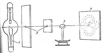 Принципиальная схема метода дана на рисунке слева; 1- рентгеновская трубка, 2 - диафрагма, 3 - кристалл, 4 - фотопластинка. Когда пучок неоднородных лучей падает на кристалл, каждая атомная плоскость отражает лучи соответствующей длины волны (согласно уравнению Вульфа-Брегга). В результате такого селективного (выборочного) отражения рентгеновских лучей отдельными плоскостями на фотопластинке получается .ряд интерференционных пятен различной интенсивности. Происхождение этих пятен для одного из семейств плоскостей иллюстрируется на рис.1.