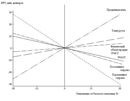Где показатель WACC – это средневзвешенное значение стоимости инвестируемого капитала. Наклон линий показывает, насколько NPV чувствительно к изменению определенного значения: чем круче наклон, тем более чувствительно к изменению переменной, тем важнее колебания этой переменной для доходности проекта в целом.