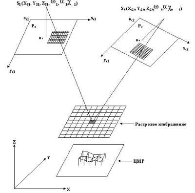 Затем по координатам XYZ центров пикселов в системе координат объекта и заданным элементам внутреннего и внешнего ориентирования стереопары макетных снимков P1 и P2 формируются путем цифрового трансформирования соответствующие фрагменты растровых изображений на макетных снимках.