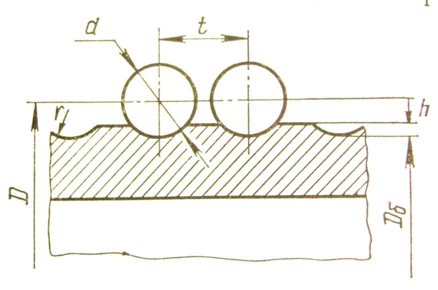 D – диаметр барабана; d – диаметр каната; t – шаг нарезки барабана; h – глубина канавки; r – радиус канавки;