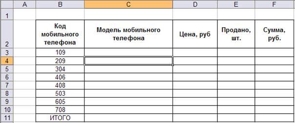 1. В итоговой таблице (рис. 3) обеспечить автоматическое заполнение данными столбцов «Модель мобильного телефона», «Цена, руб.», «Продано, шт.», используя исходные данные таблиц на рис. 1 и 2, а также функции ЕСЛИ(), ПРОСМОТР. Рассчитать сумму, полученную от продаж каждой моделей, итоговую сумму продаж.