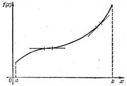Пусть функция f (х) возрастает на некотором интервале. Тогда ее график представляет собой линию, поднимающуюся при движении слева направо (рис. 2). Поэтому маленький отрезок касательной, почти совпадающий с кусочком графика, примыкающим к точке касания, будет тоже поднимающимся или, в крайнем случае, будет горизонтальным отрезком. Следовательно, угловой коэффициент касательной в любой точке кривой (т.е. значение производной) больше или равен нулю.