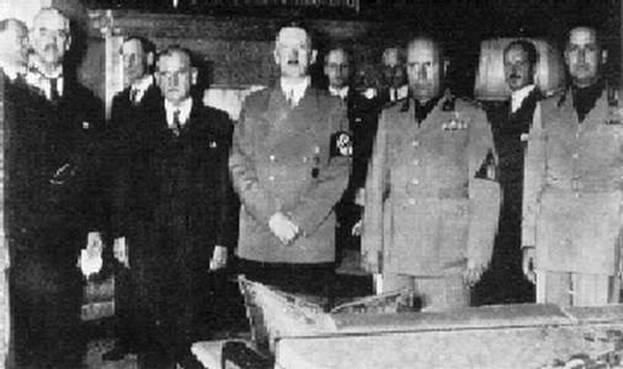 Гитлер и Муссолини (третий и четвертый слева) на Мюнхенской конференции в сентябре 1938. На этом снимке: крайний справа - граф Чиано; премьер-министр Великобритании Невилль Чемберлен - слева, Эдуард Даладье - слева от Гитлера.