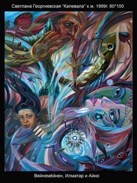 Теме финского эпоса автор посвятил целый цикл. Ее картины прежде всего поражают изяществом фантазии. В них гармонично сочетаются дух древности и веяние современных мотивов. Искусствовед Григорий Салтуп [3] утверждает, что Светлана Георгиевская реалист, но реалист, «стоящий на позиции языческой реализации духа, что автор ищет в себе древнюю гармонию с миром. Все работы С. Георгиевской основаны на углубленном знании мифологии». Посмотрим каким предстаёт Вяйнемяйнен глазами этой художницы на картинах «Вяйнемяйнен, Илматар и Айно», «Вяйнемяйнен в Туонеле» (Слайд № 9), Эти фантастичные картины относятся к одним из самых мудрых строчек в рунах: