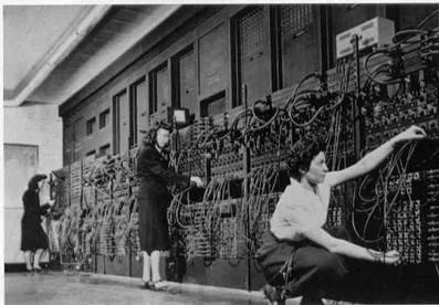 Рис.2 ENIAC – второй в мире электронный калькулятор – работал в Пенсильвании в 1943 – 1946 годах. Он еще не был компьютером в современном смысле этого слова, и смена «программы», по которой происходят вычисления, производились с помощью переключаемых проводов, как на телефонной АТС тех времен. Этот вычислитель, состоящий из 18000 электронных ламп, использовали в основном для решения баллистических задач, то есть расчета траекторий ракет.