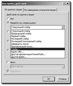 В окне Перейти по гиперссылке можно увидеть некоторое количество различных команд. Нас устроит команда Слайд…. После ее выбора программа представит нам возможность решить к какому слайду следует перейти: