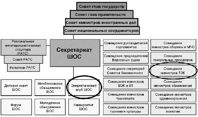 В развитии организации можно отметить тенденцию движения от обсуждения вопросов терроризма-сепаратизма-экстремизма к более широкому кругу вопросов по безопасности и далее — от типичного многостороннего сотрудничества в сфере безопасности к включению в повестку дня вопросов энергетического сотрудничества. Если в Декларации о создании ШОС энергетическая сфера лишь упоминается в ряду других (например, культура, образование, транспорт, экология и т. д.; также см. рис. 1) [2], то уже в 2007 г. в ходе саммита в Бишкеке лидеры ШОС решили создать общий энергетический рынок посредством «сопоставления энергетических стратегий в рамках ШОС» [1].