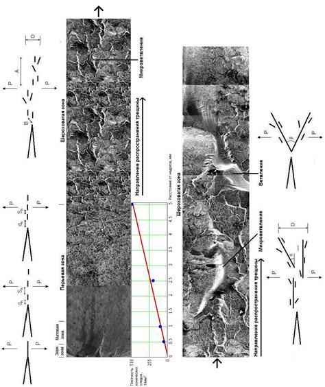 ). Волокнистая зона соответствует режиму стабильного прямолинейного распространения трещины; процесс разрушения происходит путем распространения первоначальной трещины в плоскости максимальных растягивающих напряжений в результате слияния микропор. Разрушение в радиальной зоне происходит по механизму хрупкого внутризеренного скола.