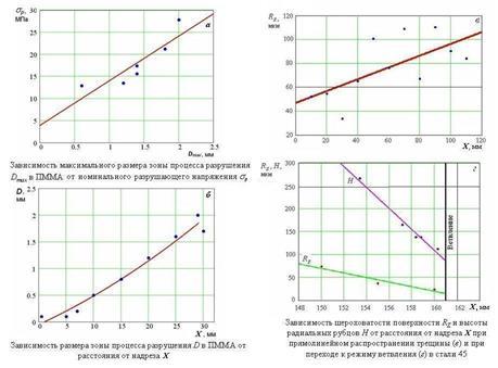 ). Иначе говоря, поперечный размер зоны процесса разрушения при распространении трещины с ветвлением в конструкционном материале, так же, как и в модельном, достигает максимума на некотором расстоянии до точки ветвления, и уменьшается непосредственно перед ветвлением.