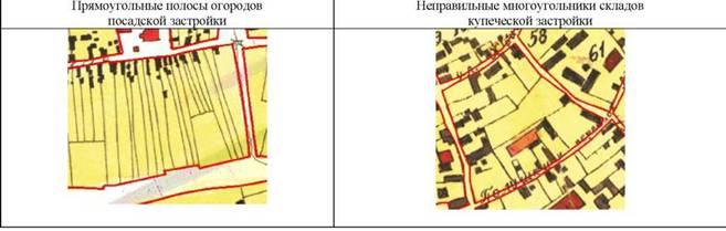 Исследовав внутреннюю структуру, мы выяснили, что микропарцеллярность города изменялась от изначально прямоугольно ячеистой (огороды) до ломано секторной (торговые склады). Это обусловлено изменением функций - подсобное хозяйство постепенно вытесняется торгово-промышленными зонами, которые характеризуются укрупнением размеров и большей застро- енностью территории.