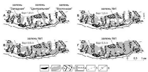г/т), бедные (борт 0,6 г/т) и убогие (борт 0,3 г/т) руды, а также построить модели рудного объема с учетом особенностей распределения каждого уровня концентрации металла и на основе природных (естественных) границ руд более достоверно определить разведанные запасы руды и золота разного качества в недрах, оценить запасы месторождения в целом. В дальнейшем отработка выделенных разновидностей руд в соответствии с их условиями залегания и параметрами может осуществляться раздельно.