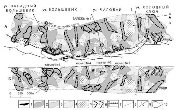Рис. 3. Месторождение Большевик. Проекции богатых, рядовых, бедных, убогих руд залежи № 1 на горизонтальную (А) и вертикальную (Б) плоскости: 1 - выходы рудных тел на поверхность или полотно карьера; 2 - контур авторских богатых руд (борт 1,8 г/т); 3 - контур рядовых руд (борт 1,2 г/т); 4 - контур бедных руд (борт 0,6 г/т); 5 - контур убогих руд (борт 0,3 г/т); 6 - границы блоков категорий С1 (а) и С2 (б) с утвержденными балансовыми запасами золота (борт 3 г/т); 7 - границы Кызыловской рудной зоны: основной шов надвига (а), разлом Южный (б); 8 - разрывы, секущие зону; 9 - оси антиклиналей II порядка; 10 - контуры добычных карьеров