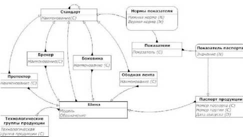 Требования к продукции описываются классом Стандарт, который является родительским классом для классов Шина, Протектор, Боковина, Ободная лента, Брекер, поскольку каждый объект этих классов наследует свойства родительского объекта-стандарта такие, как Наименование стандарта и все связи включения других классов в класс Стандарт. В данном случае класс Показатели, включенный в класс Стандарт, определяет для каждого объекта-стандарта те объекты-показатели, значения которых могут быть критичными для соответствия продукции стандарту. Поэтому включение класса Показатели в класс Стандарт идет через класс связи Нормы показателя (на схеме класс связи изображается прямоугольником со скругленными углами, который находится в разрыве пунктирной стрелки связи), объект которой для каждой пары объектов стандарт и показатель, определяемой отношением включения, может задавать диапазон ограничений значения показателя через Нижнюю норму и Верхнюю норму. Таким образом, каждый объект классов Шина, Протектор, Боковина, Ободная лента, Брекер наследует через свой объект-родитель в классе Стандарт, не только наименование этого стандарта, но также и показатели вместе с ограничениями на их значения, которым должна удовлетворять соответствующая продукция.