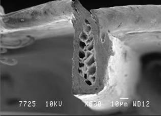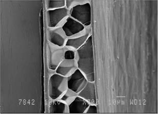 Рис. 2. Сердцевина на продольном срезе медиального участка бородки первого порядка контурной части опахала первостепенного махового пера балобана Falco cherrug (Falconidae, Falconiformes). Сканирующий электронный микроскоп (JEOL-840A), ув. х 1,400