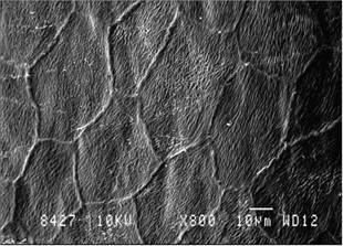 Рис. 6. Кутикулярная поверхность дистальной стороны вентрального гребня медиального участка бородки первого порядка контурной части опахала первостепенного махового пера сапсана Falko peregrinus (Falconidae, Falconiformes). Сканирующий электронный микроскоп (JEOL-840A), ув. х 800