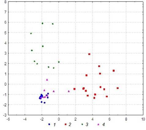 Fig. 1. Points distribution in the principal components axes. 1 - spring, 2 - early summer, 3 - late summer, 4 - autumn