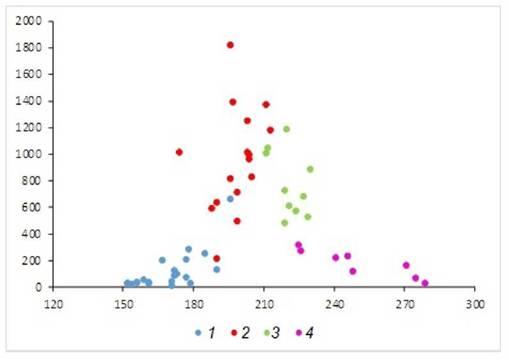 Рис. 1. Распределение данных в осях первых двух компонент. 1 - весна, 2 - раннее лето, 3 - позднее лето, 4 - осень