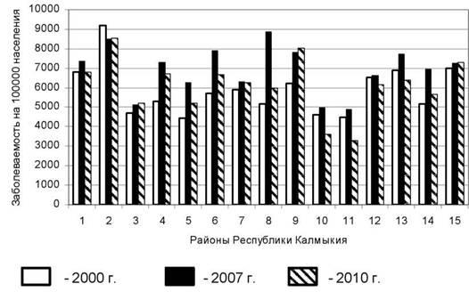 На рис. 2 представлена заболеваемость населения Калмыкии в расчете на 100 тыс. населения за отдельные годы. Наибольшее количество заболеваний наблюдается в г. Элисте. Заметно выделяются Приютненский (80321,7), Яшкульский (73053,7), Ики-Бурульский (67270,9), Лаганский (66746,9) и Малодербетовский (62727) районы республики, граничащие с сопредельными территориями (Ставропольский край, Волгоградская область, Астраханская область).