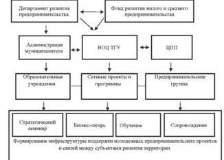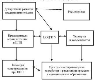 Управление разработкой и реализацией программы: этапы организации взаимодействия участников программы с разными субъектами влияния на территории. На первом этапе разработки и реализации программы (2006-2008 гг.) постановка задачи обучения будущих предпринимателей проектированию не требовала особо широкого круга участников программы. По условиям контракта с Департаментом развития предпринимательства и реального сектора экономики Томской области необходимо было подключить к проведению образовательной программы муниципальные Центры поддержки предпринимательства (ЦПП). Они осуществляли организационное сопровождение программы: формирование групп участников, отслеживание посещаемости, обеспечение условий работы преподавателей ТГУ. При этом уже на первом этапе реализации образовательной программы нами предпринимались попытки включения представителей ЦПП в ее реализацию: организация мастер-классов представителями предпринимательства в муниципалитете, организация экскурсий участников программы на предприятия, созданные предпринимателями.