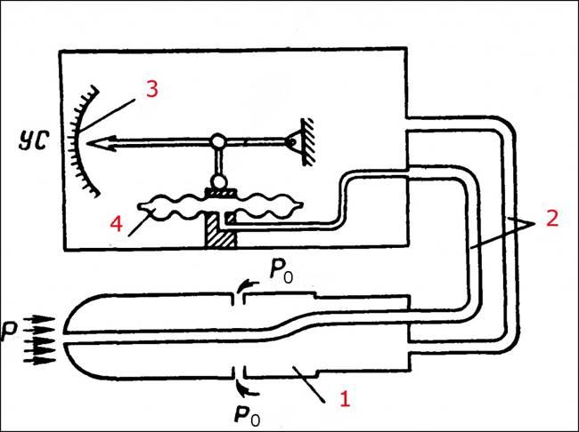 Это второе изобретение (а точнее усовершенствование) из тех двух, о которых я говорил выше. Его сделал немецкий ученый-физик Людвиг Прандтль, которого даже иногда называют отцом современной аэродинамики. Он объединил измерение полного давления потока и статического давления в одной трубке. Для этого в ней есть одно отверстие в направлении потока для полного давления и ряд отверстий на поверхности, обычно расположенных по кольцу, для статического давления. Оба эти давления обычно отводятся в герметичные емкости, разделенные чувствительной мембраной и уже ее движение передается на стрелочный указатель скорости полета. Вот и все. Все гениальное просто, как известно … Такое устройство называют трубкой Прандтля или Пито-Прандтля. На рисунке: 1 – трубка Прандтля, 2 – воздуховоды, 3 – шкала указателя скорости (УС), 4 – чувствительная мембрана.