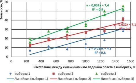 Наблюдается некоторое уменьшение влажности по падению пласта: 1-я выборка — 41,3 % (31...50 %), 2-я выборка — 36,6 % (24...40 %), 3-я выборка — 30,2 % (20...39 %) (рис. 3).