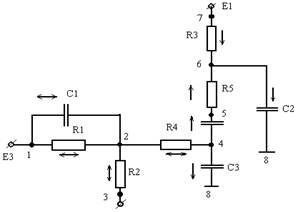 Нумерация узлов схемы осуществляется десятичным числами. Порядок нумерации узлов и описание элементов произволен. Далее нужно проставить направление токов через двухполюсные ветви, ветви резистивные R, емкостные С и ветви источников напряжений Е. Выбор положительных направлений токов произволен для всех ветвей R и С, за исключением ветвей источников напряжений, для которых направление тока выбирается от отрицательного полюса к положительному полюсу (в этом случае в массиве параметров компонентов для ЭДС указывается положительное значение). Для транзисторов проставление направления токов не требуется, достаточно указать тип проводимости транзистора и его модель.