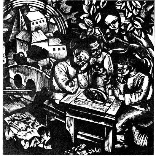 На первом плане сцена трапезы – некий вариант ветхозаветной троицы. Мужиковатые, кряжистые, как будто вырезанные из целого куска дерева, фигуры странников мало похожи на библейские персонажи: в них что-то простодушное от первых купреяновских гравюр. Трапеза изображена в ракурсе и сдвинута в правый край. За спиной левого странника развёрнут городской пейзаж: по выгнутому дугой мосту с тремя (повторение темы троичности) чёрными арками в сторону пустынного города тянется чёрная пустая телега (как «чёрная телега» с мёртвыми телами у Пушкина в «Пире во время чумы»). На мосту – булыжная кладка (как в «Битюге»). Сама трапеза не строго канонична, а приобретает оттенок жанра. Грубо сколоченный стол, на нём – в тарелке рыба. Присутствующая здесь как символ Христа, но рядом – современная деталь – большой чайник; у стола слева – большое чёрное пятно, очень напоминающее кошку своим силуэтом: в русском фольклоре кошка олицетворяла домового. Над странниками, подобно Богоматери, склонилась женщина с ребёнком. Женщина здесь, подобна радуге, поднявшаяся над этим городом мёртвых, символизирует жизнь и просветление. Тема трапезы – тема символа духовного единения, готовности к самопожертвованию – сохранила свой высокий смысл, хотя сильно упрощена и сближена с реальностью. Но эта тема ещё долго будет в гравюрах Купреянова символизировать патриархальный уклад домашней семейной жизни. Смысл гравюры проступает в контексте полубиблейских, полу литературных интерпретаций, окрашенных драматизмом своего времени.