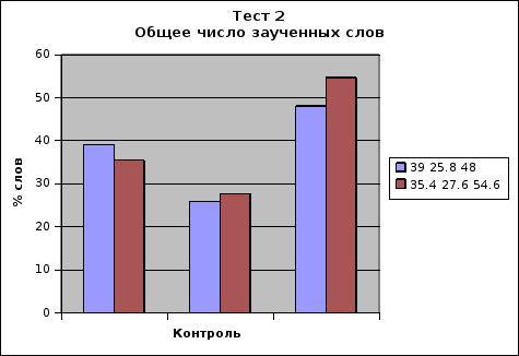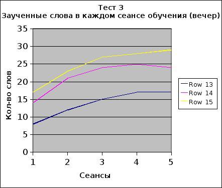 Количество слов, заученных в каждом сеансе обучения значительно возросло от Контроля № 1 к Контролю № 3 утром и вечером. (утро: 1 сеанс – от 8 до 18, 2 сеанс – от 12 до 24, 3 сеанс – от 15 до 26, 4 сеанс – от 17 до 27, 5 сеанс – от 18 до 28; вечер: 1 сеанс – от 8 до 17, 2 сеанс – от 12 до 23, 3 сеанс – от 15 до 27, 4 сеанс – от 17 до 28, 5 сеанс – от 17 до 28). Результаты сравнительной статистики достоверны, хотя коэффициент достоверности возрос в 2 раза от 0,02 до 0,047.