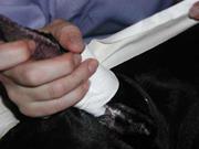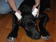 После этого ушные раковины укладывают на затылке на марлевую подушечку и прибинтовывают. Время снятия повязки после операции – предмет активных споров специалистов ветеринарной хирургии. Одни врачи рекомендуют снимать повязку на 3 – 4-й день, а другие – через 3-4 часа, и вообще подвергают сомнению саму целесообразность её наложения.