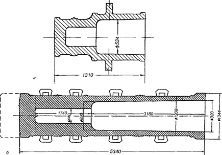 Затем литейную форму собирали устанавливали внутри стержень, раскрепляя его специальными приспособлениями — жеребейками, прикрепляли к форме ствола форму для казенной части Продольный разрез формы показан на рис. 3, а.
