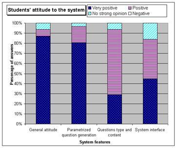 Для оценивания субъективного мнения студентов о системе по окончании курса мы предложили студентам, которые наработали достаточную статистику взаимодействия с системой, заполнить вопросник относительно различных характеристик QuizPACK. "Достаточным" считалось взять в QuizPACK 10 или более тестов по 6 или более различным темам в течение нескольких сессий, разнесенных на 20 или более дней. Для дополнительной мотивации за участие студентам начислялось небольшое количество добавочных баллов.