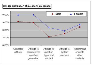В дополнение к общему анализу мы попытались сравнить отношение к системе для разных групп студентов. На данный момент мы завершили сравнение ответов для групп, выделенных по половому признаку, и получили довольно интересные результаты. На рисунке 3 изображены профили ответов, данные студентами и студентками. Мы подсчитали средние значения для ответов на вопросы, оценивающие основные свойства системы, и выразили их в процентах. 100% означает что все студенты в этой группе дали ответ "очень хорошо". Заметно, что график обозначающий ответы женщин проходит выше "мужского" графика для всех вопросов. Разница достаточно существенна и для некоторых вопросов составляет 10%. В частности, график показывает, что все студенты в женской группе выразили стопроцентно-положительное отношение к системе в целом и к ее способности генерировать параметризуемые вопросы. Этот факт не обусловлен тем, что студентки больше/меньше работали с системой или были более/менее успешны. Данные говорят об обратном: среднее количество вопросов, на которые пытались ответить студенты в течение семестра – 187 для женщин и 178 для мужчин. Разница между средним значением успешности – практически нулевая (37.12% правильных ответов для женщин и 37.26% -для мужчин). Возможной объяснением может быть предположение, что исключительно положительное отношение студенток к системе отражает тот факт, что в течение курса QuizPACK был действительно важным средством обучения для них. Важно и то, что в нашем курсе женщины, традиционно показывающие менее высокие результаты по техническим предметам, нежели мужчины, в итоге получили более высокую среднюю итоговую оценку. Интересно также и то, что даже студентки, получившие в итоге "3", "4-" или ниже, тем не менее высказали свое одобрение системы.