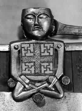 Выше: Свастику можно увидеть на резьбе по кости, получившей название “айагапта”, в Матуре, Индия. Эта эмблема – одно из оставшихся свидетельств о племени северных индоевропейцев, называвших себя ариями, которое вторглось в Индию. Со временем арии были поглощены окружающими не-белыми массами, создавая кастовую систему, присутствующую в этой стране и в наши дни.