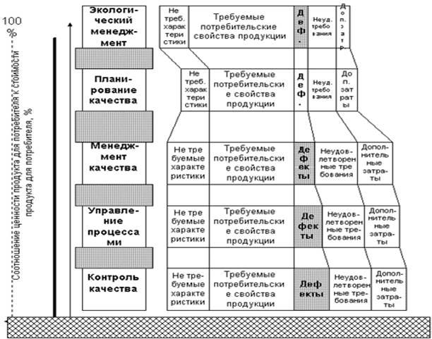 Можно сказать, что именно на этой фазе обеспечения качества сложился менеджмент качества в его современном понимании. Противоречие между повышением качества и ростом эффективности производства в его прежних формах было преодолено - применение новых идей управления позволило одновременно повышать качество и снижать затраты на производство. Потребитель практически во всех странах стал получать товары и услуги высочайшего качества по доступной цене - идея “общества потребления” воплотилась в жизнь. В то же время, концепция стандартизованного качества, согласно которой под качественным изделием понимается изделие, требования к которому определил и зафиксировал в нормах производитель, а потребитель вправе либо купить предложенный продукт, либо отвергнуть его, привела к обострению противоречия между качеством и эффективностью в новой форме, - при ошибке в определении запросов потребителей при выходе годных, с точки зрения производителей, изделий на рынок затраты чрезвычайно велики.