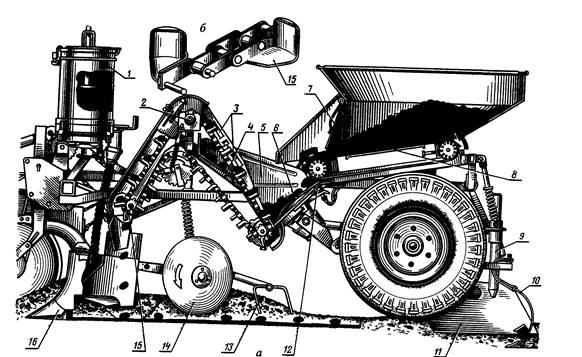 Рихлювач сліду коліс 10(пружинна лапа з наральником) рихлить грунт, ущільнений колесом машини. Прироботі на схилі до 5° стабілізатор 11 утримує машину від сповзання
