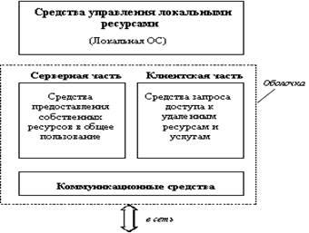 - Средства запроса доступа к удаленным ресурсам и услугам и их использования - клиентская часть ОС (редиректор). Эта часть выполняет распознавание и перенаправление в сеть запросов к удаленным ресурсам от приложений и пользователей, при этом запрос поступает от приложения в локальной форме, а передается в сеть в другой форме, соответствующей требованиям сервера. Клиентская часть также осуществляет прием ответов от серверов и преобразование их в локальный формат, так что для приложения выполнение локальных и удаленных запросов неразличимо.