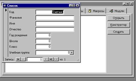 · Сохранить введенные данные. Имя формы – Список. Закрыть форму.