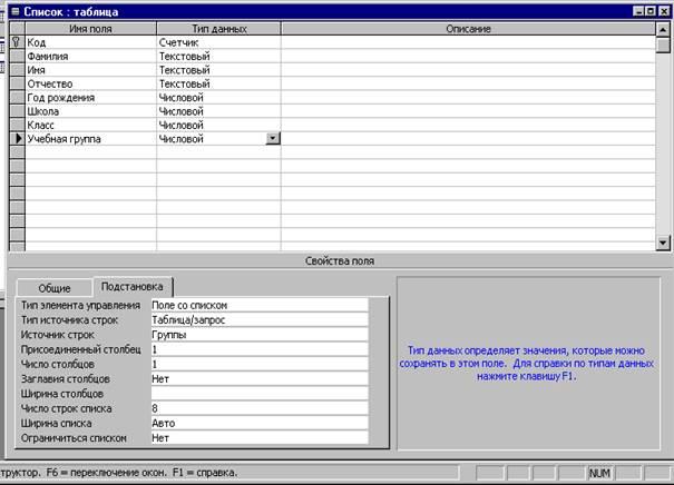 · Перейдем в режим Конструктор и посмотрим, как заданы поля. Сделаем поле Код ключевым, поместив курсор на имя этого поля и нажав кнопку – Ключевое поле. Тип поля Код – счетчик, полей Фамилия, Имя, Отчество – текстовые, полей Год рождения, Школа, Класс, Учебная группа – числовые. С полем Учебная группа разговор особый. Его тип – числовой. Общие свойства поля не меняем. Кроме того, значение этого поля надо не набивать в ручную, а выбирать из списка, содержащегося в таблице Группы. Для этого в свойствах поля следует указать, что здесь имеет место подстановка по следующей схеме: выберем вкладку Подстановка, тип элемента управления – Поле со списком, источник строк – Группы. Получим значения элементов, как показано на рисунке 3.