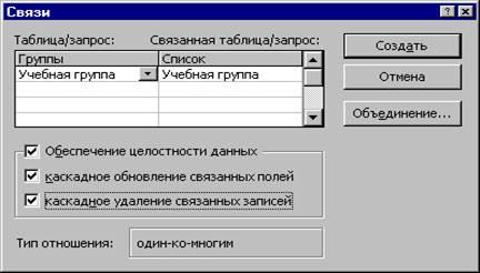 · Включим значок Каскадное обновление связанных полей. Это приведет к тому, что при изменении номера группы в таблице Группы автоматически изменится соответствующий номер в таблице Список.